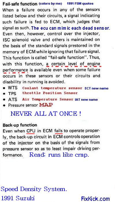 Starting In 1996 most of all the above is moot, after all you connect that $9 OBD2 scan tool and see all the PID and DTC information and it's all 100% clear what is going on ECU wise; for sure. The 96 and newer cars can flash the CEL lamp driving (nocode), for a CAT burn up warning. (the operators guide , in Oh'bummers English, says "to drive slow and park your tailer and get service soon" Starting in 1996 (Many more DTCs were added, and many new OBD monitors and way less punishment "features"{sic}) My new Jeep car has 1000+ DTCs the old Suzuki had 31. The hard thing about OBD1 cars is working blind. No scan tools. (ok ,1 hackers tool ,sold in the whole world , and off shore to boot) Is the ECU seeing bad sensors (CEL Glows? running?) or is it lost?, or is engine so messed up, that the ECU can not control it? (eg. a dead cylinders) If the 8v ECU has dead injector, the engine stops, period. (same with zero fuel pressure) There is no DTC to tell you that. No injector pulse read back, not on the old dumb system, nor any fuel pressure sensors. (a bad idea from day one in my opinion) If the 16v has a dead injector you have a 3 cylinder engine, it runs ratty, misfiring , shaking, and the 02 sensors, see tons of oxygen and the ECU goes nuts and injects too much fuel to the good injectors. Same deal, No DTC telling you the injector line is dead. but may get oxy sensor errors, and rich errors, if car is 1996 and newer and misfire errors. At no time, will most any old ECU tell you a sensor is out of calibration , usually only DEAD sensors. ( one execption on USA cars, is the weak EGR flow code 51) That is why, I look at the live data and compare it to good data. To see if the sensor reads wrong, (as the ECU sees it). Case in point, coolant temperature is really at 180F, but the ECT reads 150F. (the ECT is bad or air pockets are there, RADiator NOT FULL) The ECU will never leave warm up mode at 150F MPG (fuel economy) goes horrid. 15mpg is common. The old ECU will never ever tell you this happened. (unless the wires fall off the ECT) My newer 2004, H25 engine does show, coolant late to proper temp.'s. a DTC just for this error. With OBD1, you have to do all this work by hand with meters and gauges. 1 by 1, checking it all. But do consider all DTCs thrown, seriously. These old ECU just hate: (go nuts or gets LOST) Too low /too high fuel pressure,(bad FPR) dead injectors, leaking injectors, dead cylinders (compression) and the most common of all, never changing the Cam belt and x4 cylinders at 80PSI compression. The old ECU will not show DTC errors with many catastrophic errors in the engine, or for example a ECT sensor reading, -30F in Key West.FL.. (it's just clueless) Factoid 1: The 4sp TCM Tranny brain has failsafe too, It skips 2nd gear. and steady glows or flashes the OD lamp, as one more clue. FUEL TRIM !: The bread & butter of EFI. STFT means short term fuel trim and LTFT means long term fuel..... trim. The whole purpose of good fueling rates, are a working fuel trim system. for lowest smog, highest MPG and max engine life. I check LONG fuel trim , every time I look. (that it is running and working and now is in the center of it's range) Plus closed loop status, at idle and light steady cruise. The OFFICIAL SUZUKI pages, annotated in blue and red below: (very brief, for such a profound impact !) Below is the anemic Suzuki doc's on Failsafe and backup , The left side image below, is old OBD1 cars (89-95) Translating, old sensor names, Pressure sensor means MAF/MAP (air meter/baro sensor) (stuck at 0v or at 5v the are deemed bad.) WTS (water temp sensor)= ECT (called engine coolant temp, today) (deemed dead, if open or shorted only, both temp sensors) ATS (air temp.)= IAT (called Intake Air temp , today) The TPS throttle angle pin, is deemed dead (below 0.2volts or above 4 volts) approx. (it shorted or open,) See the word "Certain"(to whom?) below, they really mean REDUCED. (in some cases, grossly reduced) Add MAF to the word MAP below, "MAP/MAF" as the case may be.. The backup mode , we think the CEL lamp goes DEAD totally. The TPS is on the throttle angle side failsafe goes active, the idle switch does set a DTC but does not go to failsafe mode (I think) Photo 1: from FSM. USA BOOKS! Photo 2: FSM. (actually copy and pasted) The 16v ECU ,does run with the MAF unplugged (with DTC warnings for each, the 8v runs with the MAP unplugged (both horridly) For fun , on my 8v (91) I unplugged all sensors 1 by 1 and found out when I last unplugged the TPS, car died. The TPS is used to mimic the MAP so... it dies. Tests that I've done show that a dead MAF (or MAP on TBI 8v) the ECU goes to limphome and uses the TPS and RPM as the backup air metering device. It can emulate most the sensors, but not all sensors at once. (seems logical for sure) In some cases (ECU) a pulled ECT , the ECT now uses a fixed temperature, or on some cars a table based on time . Time from startup . Pulling he CMP sensor kills spark dead , (and injections 2nd) and sets a DTC for that. The ECU even reports CMP drop outs of 1 in 10. (even cranking, !!!) Cam sensor. The 16v (96+) can run with a dead CKP (crank sensor), but kills dead the OBD2 "MISFIRE MONITOR", and that fails you for smog test. "dead monitor and DTC for CKP: CKP = crank sensor, below front bottom of oil pump. Starting in 1996. (USA) This is Not bad, really, these False-safe features, but Beats walking home in the snow. ? or worse? On new cars the car goes to RPM limits and Speed limits (limphome extremes) at the first sign of idle speed issues. (my car has 4 TPS sensors, a 2008 JEEP or the throttle motor sticks !) Fail-safe and for sure Backup mode: The engine performance is greatly reduced and smog emissions will be horrible and the CAT may burn to a crisp. ONLINE information from any of the 3 top USA sites, Alldata/Michell's or Chilton's commercial data bases: If you go on line to FSM live data base and watch the live video: (on line docs for pre 99 Suzuki's are ver
