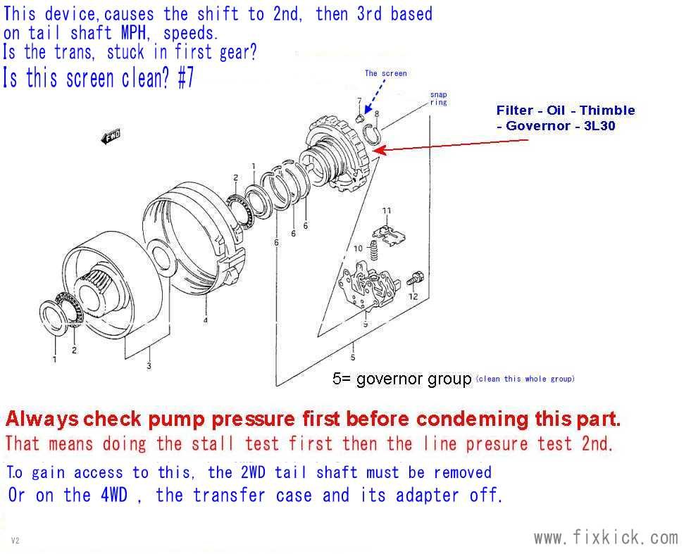 this is the Governor, it is a centrifugal device, that measures SPEED of the tail shaft. (RPM) and if it's dead, there will be no up shifts. It too, has a screen that loves to clog when not ATF serviced. See the blue lines , in photo 2 here. The band here is low band.