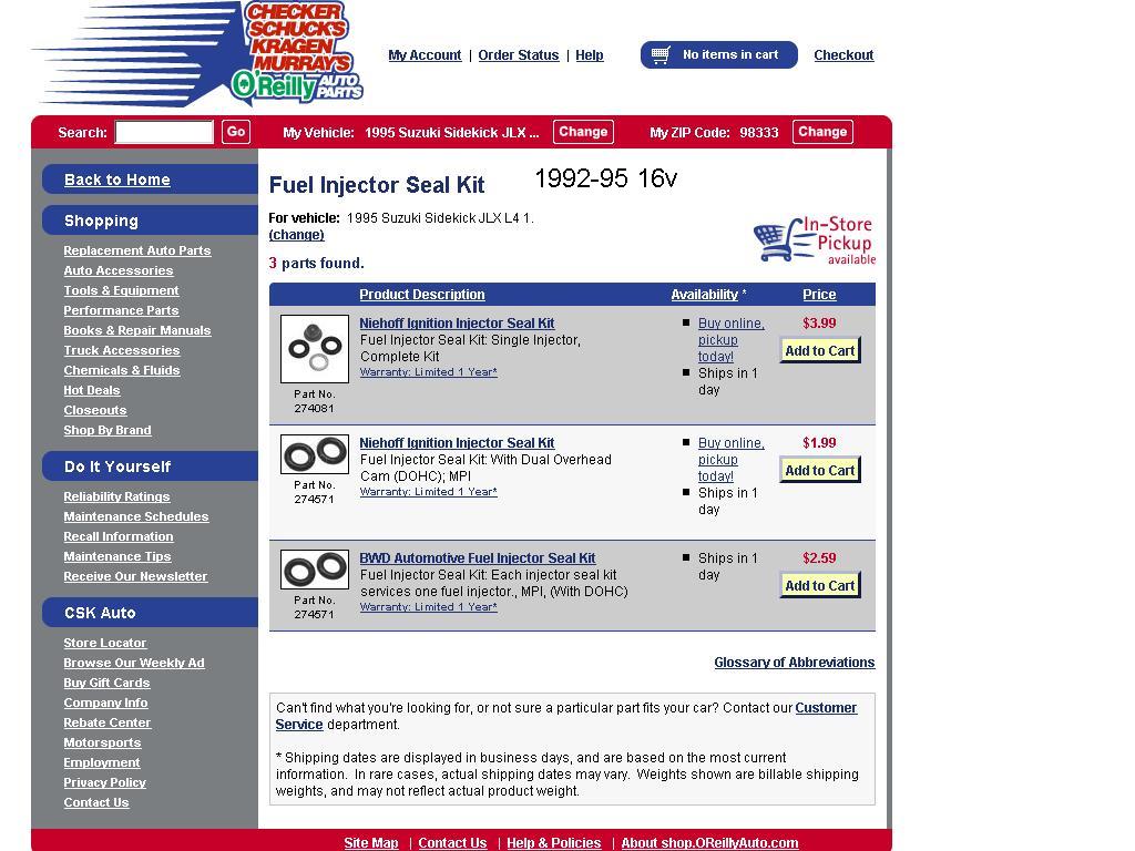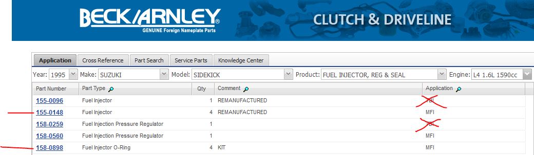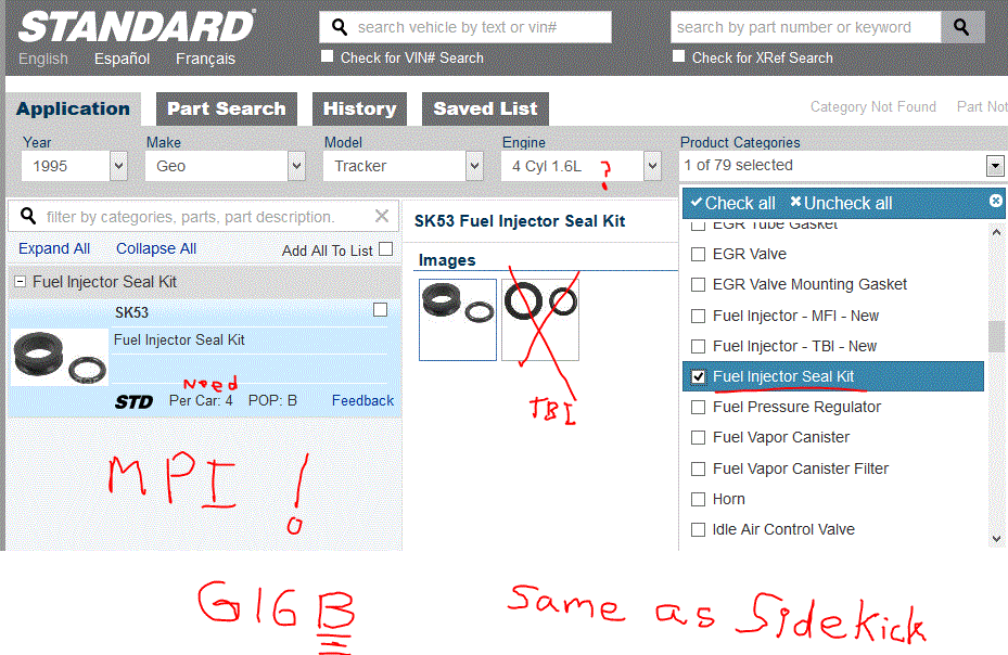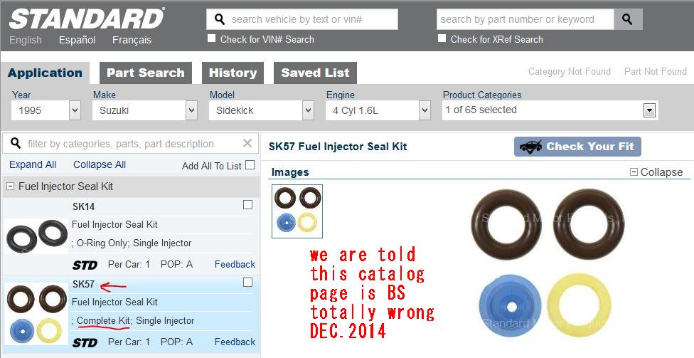 covered: ![]() If you landed here in error , hit home above . (going back to my hard to find parts page) This page has 2 chapters, First Chapter 1, MPI 16v (multipoint...) Jump to TBI 8V and Chapter 2 TBI 8v. (singlepoint. Injection...) These parts are not hard to buy or find, the below is still used in a 2004 Mitsubishi Lancer, and others. What is hard, is the sellers have no idea what engine you have, because Suzuki does not have a correct VIN. for G16A and B. Chapter 1: 16v MPI (multipoint) 1992 to 1998 G16B only. This engine has 4 injectors, 4 O rings and 4 intake cushions (top row of below is cushions and and vary by year.) The trick with MPI is each company that makes, them offeres them is different forms. ( fuel side , air side, or both , or single kit or quad kits) A real pain in the backside, sorting this out as the sellers , don't say what they are selling or the photos are blank or wrong, or stock photos of wrong cars......... pain.. Nor have Instructions for which parts fits where (imagine yours mangled beyond recognition) ![]() TOP MANUFACTURES: SMP or BECK. MPI continued (16v) Suzuki OEM p/n: The Real THING ! OEM. PARTS FROM SUZUKI, I'd never attempt this at GM (Geo). OEM kits are very expensive. 500% more in fact. Suzuki p/n below: (ID = data base parts blowup ID #) ID 11, cushion (intake man side) 09320-08062 quantity 1 , not a set. ID 9 , rail seal grommet set, pair 15716-58BT0 same unit of issue. 1 both now sell for $28 and times 4, not cheap and any Suzuki counter. Suzuki does not sell a full kit for all 4 injectors , so to make up a kit , the total cost would be $112. plus shipping. OUCH. ( and more today 2014. ) Dealer prices very by location, as does shipping costs and methods and huge delays from main SUZUKI ware house to them and then later to you. LONG waits. 14 days is common. Not only that chapter 11 here makes driving to SUZUKI hard, very hard. (its gone !) Use Rockauto to see the seals. See them here? See them list the wrong SK57 seals, that is because the SMP catalog is WRONG, so echo's at ROCK. MPI continued (16v) What some parts houses sell: . They are very inexpensive compared to Suzuki. The parts must be fuel proof and 200ºF+ thermal proof. (actually more, if the engine overheats do you want the seals leaking then, NO) Engineering 101.? Yes, all makers now have an E-Catalog, Google finds this is 1 second, flat today, unlike in 2007. but... the executions, well, sucks. Sucks Swamp gas. The SMP brand "Standard" has errors in their catalog (2014) showing SK57 as fit, this is wrong. Looking at all G16Bs (GM and Suzuki) the catalog has errors. (I did file the complaint) The correct seal is SK53, (we think) SMP fails to list MPI seal kits until 1994, oops and they have them oops 2 ! and gets it wrong. and no J18 sport seals. and for GM ,(Geo) They show SK53 fits, and is same exact engine, then fails to show its MPI injector , even though they sell MPI and TBI injector, one line up. So I think if you order, SK53 for all Trackers and all Sidekicks MPI 1992 to 1998 it's a win.. or buy BECK. In 1999 it changes to SK18 (theory) When SMP wakes up and learn there are 2 engines, this will end. G16a or b (TBI / MPI respective) GM calls them KC and KV engine, (2door, or 4 door magic code USA BS) In Europe they have 1995 2 door 16v cars. or ask the MPI/TBI question in the last box. Please. (why mix parts? what good can come from that?) Why kill sales with missing parts, or wrong, SMP? Beck claims this. Beck 158-0898 Now find who sells them ! First find the right seal kit, then Google for local supply. Like Beck 158-0898 Hope I just saved you $100 to Suzuki wallet killers. |