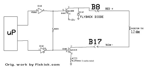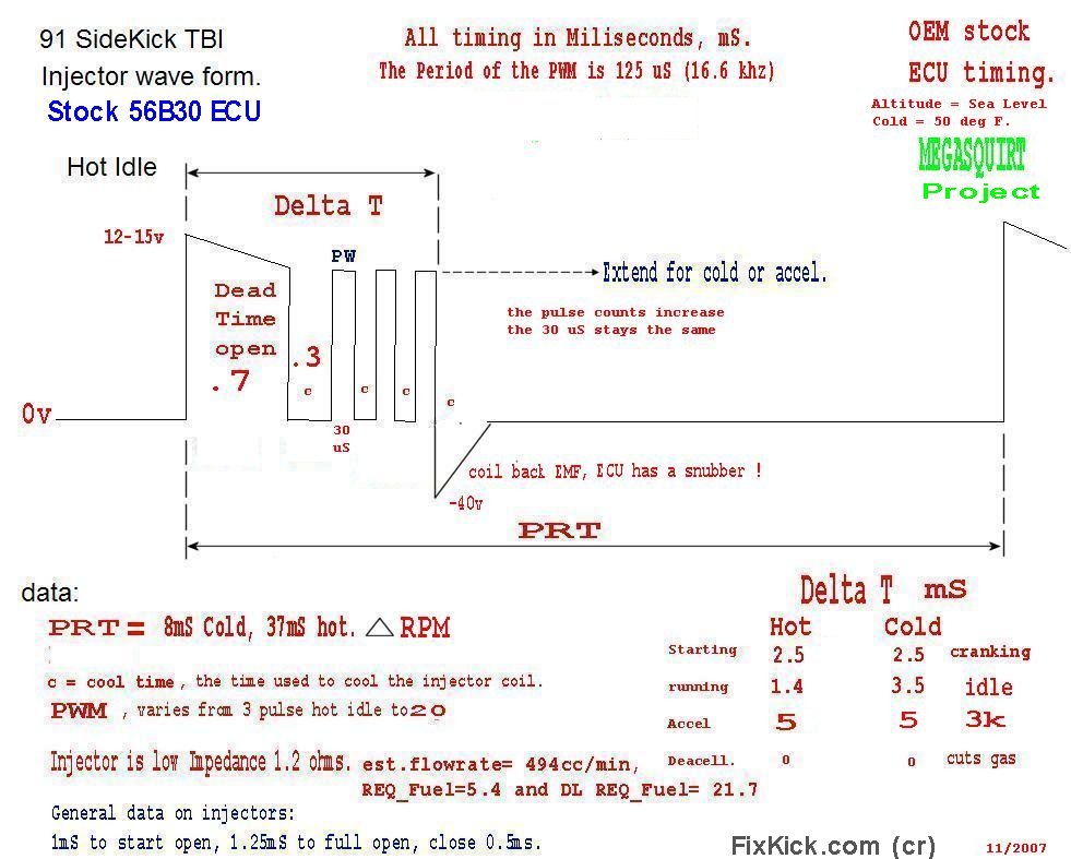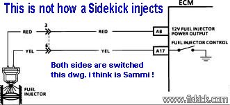 ![]() 1989 to 1995 (Sidekicks and Trackers) 8 valve TBI engines, only. Throttle body injecton, or Single Point Injection SPI = TBI At wits end?, engine runs bad, and you find the injection pulse widths are all wrong at hot idle? 1.4 mS is normal at idle 1.4/1000 seconds. (and all sensor read correctly?) To someone, that said to me, wow, my car runs (kinda ok) with the Injector Red wired shorted to the battery Plus terminal. (or B17 hack wired to ground) Sure it runs, but running and getting 15 MPG is not running correctly is it? Most tech's discover, the rich running engine via a variety of tests (and symptoms), the simplest being, that the motor never holds closed loop status (OBD1/2 Scan tool discovery) The Technician (any ASE) then connects his scope to the red injector wire connector, this wire, is the injection rate wire, the yellow is only and enable pulse! He discovers that the wire is dead. and that the static timed pulse on the yellow wire, is the only means of injection, he knows this is wrong. He finds that a customer added a hack, an illegal hot wire jumpered from B8, to the battery plus or IG-COIL fuse (etc). He removes this hack, and the engine dies. (so some one was hidding a bad ECU !) Now I know why the simple NOID lamp passes, but in fact the injector Drive is 100% wrong ! (keep in mind either injector transistors below, can short and do the same thing (or open and make a dead NOID lamp test) That is why, we have the advanced NOID test, here, be sure to test both wires for pulsing actions. The Suzuki Sidekick does not use a full time HOT Red pin A8 pin ! Nor does the Samurai of any kind, but only a Metro/Swift runs a hot 12vdc Resistor block. The Samurai FSM books have this crazy drawing#1 below, ( you need to ditch this drawing, for Sidekicks ,really !) Drawing #1 (bogus to the n-th degree) Seen in some Samurai books and is wrong. ![]() The Suzuki G16A TBI , uses this exact method to inject below , this is my reverse engineered drawing. Click the drawing below, to ZOOM it. Drawing 2: (my drawing !, this is accurate at the pins stated) As you can see it's a DUAL driver and drives ground and power, and both are PULSED, or it will never work correctly. ![]() The RED WIRE B8 , LOOKS LIKE THIS ON A SCOPE This is the action of Q101, transistor. A real photo on a 1991 TBI. ( the scope don't lie) ![]() If I accelerate or cause the MAP vacuum to drop the ECU responds on the RED wire with the below ACTIONS ! Note how the injector is cooled with the fast Negative pulses, and that these PW pulses, add up, as you gun the throttle (engine load, MAP changes) This is the sure sign of working injection. (It is very hard to photograph this , so I made a drawing, to show these actions. The injector does not close, at the PW fast plus pulses ! (the cooling cycles do not effect injection rates ) (also, the fuel is the other coolant !) Truly the below facts are all you need. Check it carefully. The whole point of fuel injection, happens , right here ! The RED wire again. B8. (my hand drawing is the combined scope views, fast and slow sweeps. making the scale below wrong, but numbers are correct) The yellow wire (enable) looks like this. The Low signal is the Enable signal . The purpose of this signal is to protect the injector if Q101 shorts, or some nincompoop, shorts the Red wire to the battery. Dah? This one OHM coil Injector burns to a crisp in 1 second at full 12vdc power, full time. Math: (Ohms law) If you put full power to the injector. here. P = I² x R or P = 12 x 12 x 1 , given I =12 amps (I=E/R) then 12 squared is 144, or 144 watts, a hopeless overload. The Yellow wire is the protection signal, if the injector shorts. it protects the $1700 new ECU, too. (not a bad idea, huh?) ![]() The Transverse connected. RED to Yellow wire signal, looks like this, this is what your NOID tests sees. Sure the car runs, but will run rich and the ECU will go quite nuts, due to having no control over fuel injections. The ECU may jump in and out of limphome (failsafe) and loose idle controls and run RETARDED, spark advance tables. Last my injector flow rates. Before and After cleaned. ( we do not have flow rates /versus time spec from Suzuki, that is why I made the drawing above.) ![]() The next drawing is to help , Metro owners that land here by accident. (goggle finds this) The same rules apply, no Spark errors, no CMP errors. (DTC errors) And the Resistor block must be good. (I think the injector sees 1/3 the volts (5v) DC fired , ) ![]() The Metro injector resistor block is on the top right of the firewall, looks like a heat sink with a yellow clip attaching two white wires coming off of the resistor to a white wire with a blue stripe and a yellow wire. 2.3 to 2.5 ohms was measured across the resistor , by one person. If the resistor burns up, all injections stop. Infinity readings, is bad in all cases. The TBI injector coil, on the metro is 0.5 to 1.5 ohms. The resistor block was used on all TBI metro, and never MPI engines of any kind and used on G10 and G13 engines with TBI, all MPI engines are free of this block. The Metro MPI injectors read . Resistance should be between 12.0 to 13.0 ohms. At the Metro, injector yellow wire gets 12vdc key on, not running, and then goes to less than 1/2 that, firing. (only a scope can see that lower voltage durning the 3mS pulse. ( Current flows at near 5 amps, and the 1ohm injector drops about 5 volts, using ohms laws) The noid lamp still must flash in place of the injector. The noid must not glow key on. (not running) If the Yellow wire is not 12vdc keyon, then the resistor is blow, or the main relay is bad, or the "FI" fuse is blown. Key on both sides of the Resistor must be at 12vdc (not running). Or the problem is obvious.( meter in hand) ver 4. 4-8-2013 , |